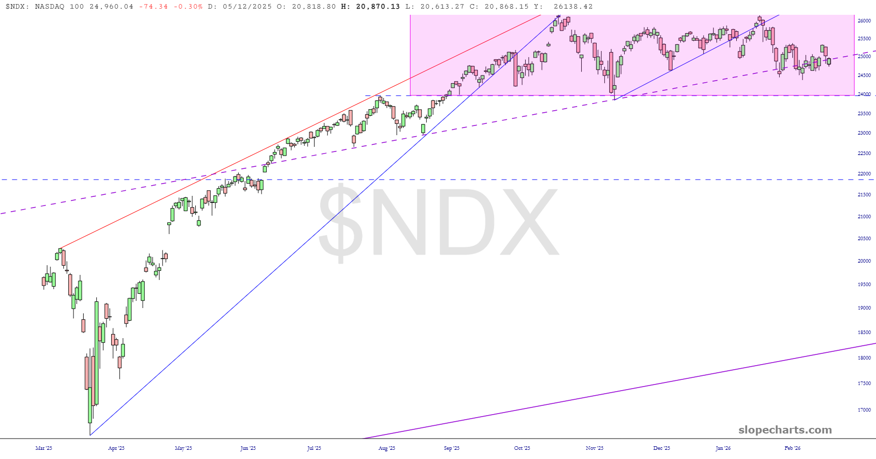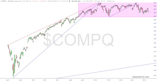 The NASDAQ Composite shows this range quite plainly in the tinted zone.