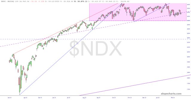 The NASDAQ 100 is, like the Composite, range-bound and roughly the same price level it was before Halloween.