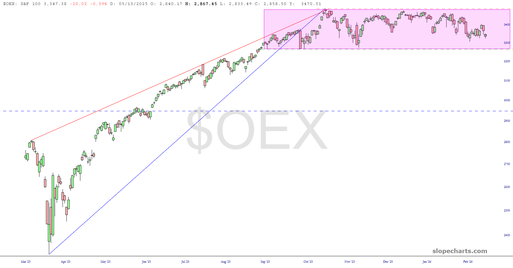 Here is the S&P 100 which is about 90% done with what could, I say again could, be an important topping pattern. It isn’t complete yet, but that support level demands attention.