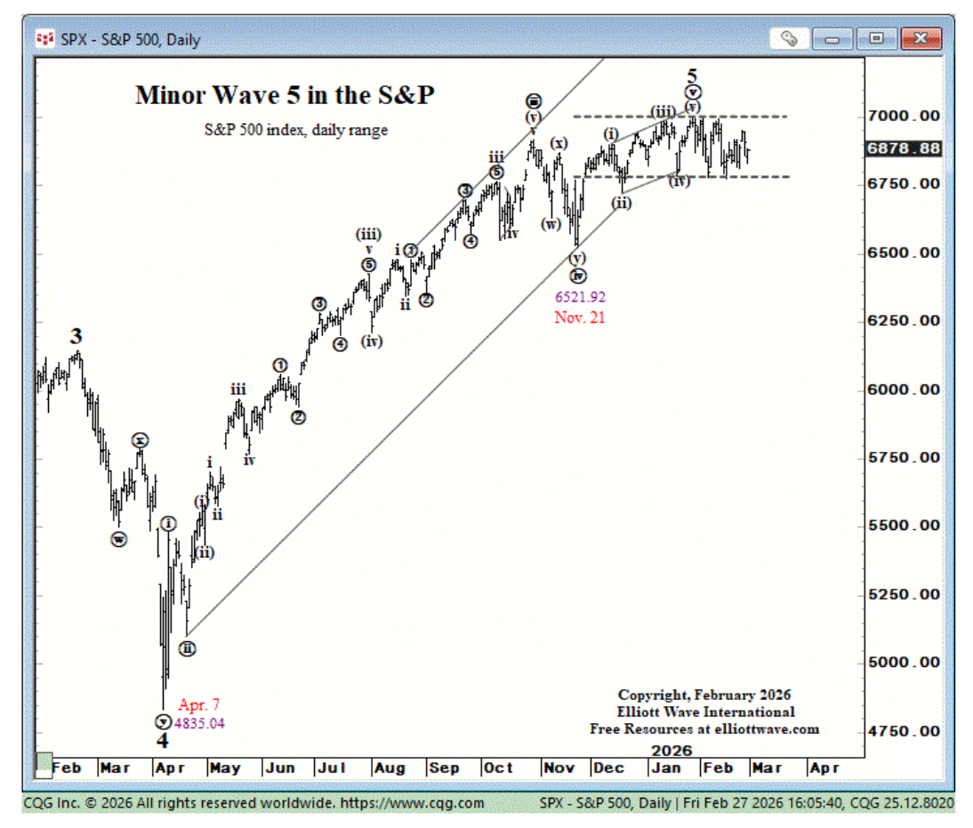 Our friends down in Gainesville have their own perspective of the market. From their perspective, the top is already in, and we’re all just waiting for a cut below the lower horizontal line for wave 3 to kick into gear. This applies to the S&P 500……..