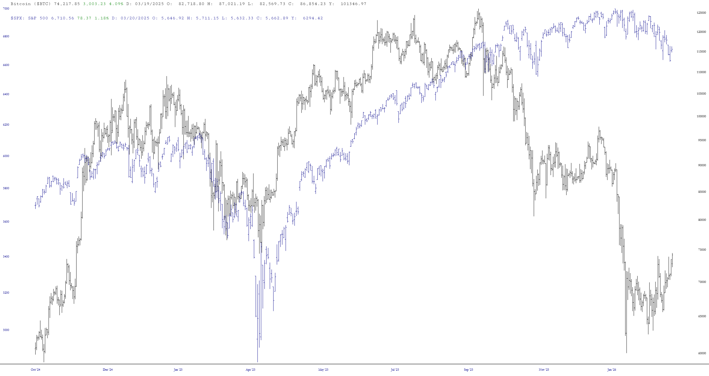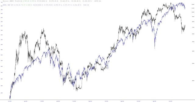 Below is a layered chart illustrating, over a fully six years, how Bitcoin (black line) tends to trade strongly with the S&P 500 (blue line). There are times that the gap between them is substantial, such as recently, whereas for the bulk of this chart they were virtually in lockstep.