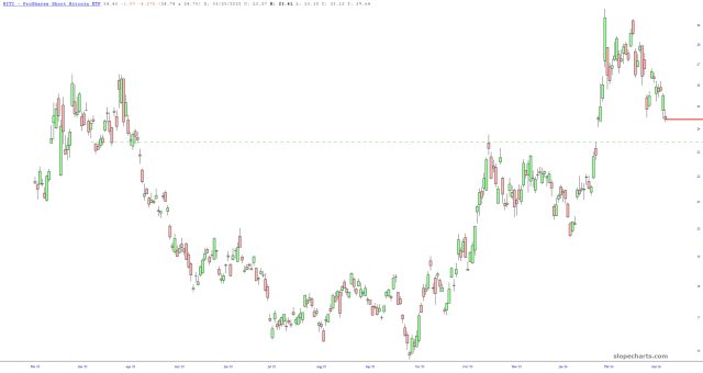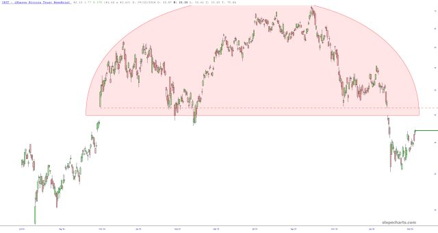 Alternately, look at BITI, the inverse bitcoin fund (which is how I’d go about placing the trade). The same price gap is beckoning there.