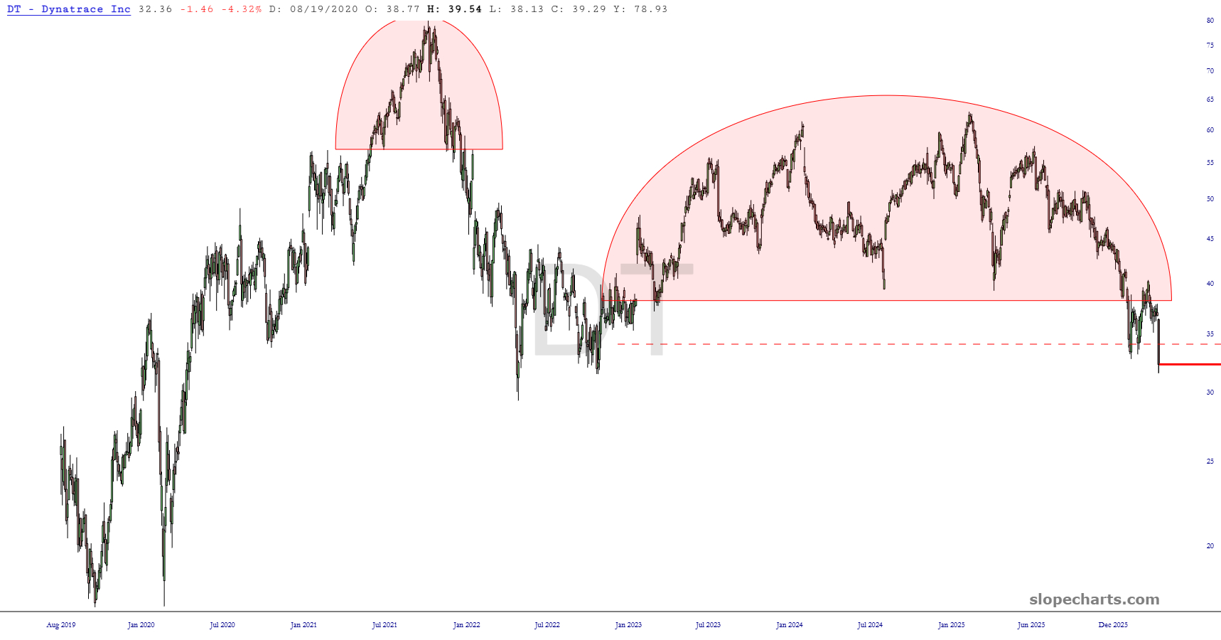 Below are the charts for all the short positions in this portfolio; as usual, I’ve zoomed in the most important recent portion of history, and the dashed red line denotes the stop-loss price.