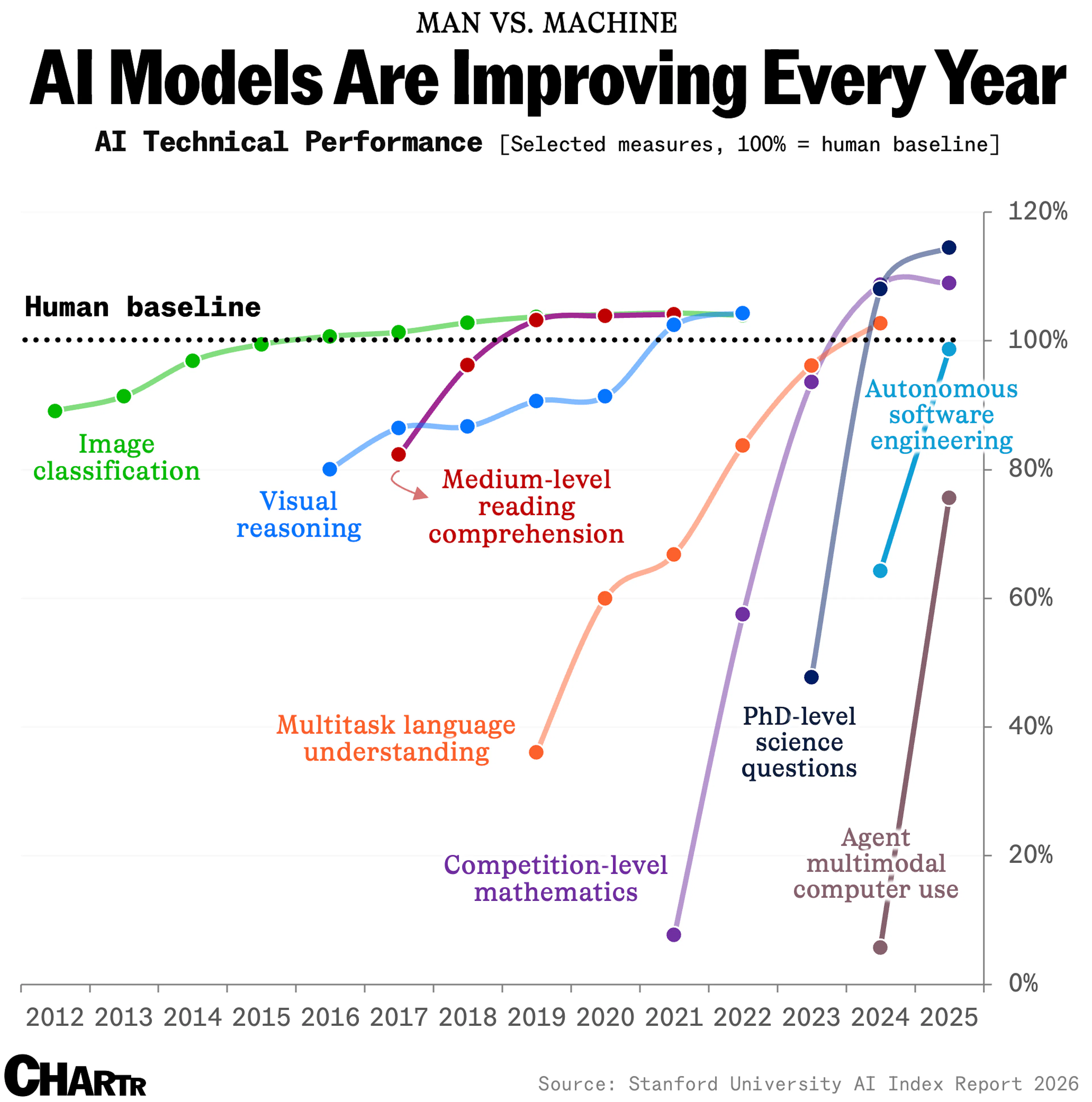 Here is a graph even scarier than that of the NASDAQ 100: the acceleration of AI in various fields toward human-level proficiency and far beyond.