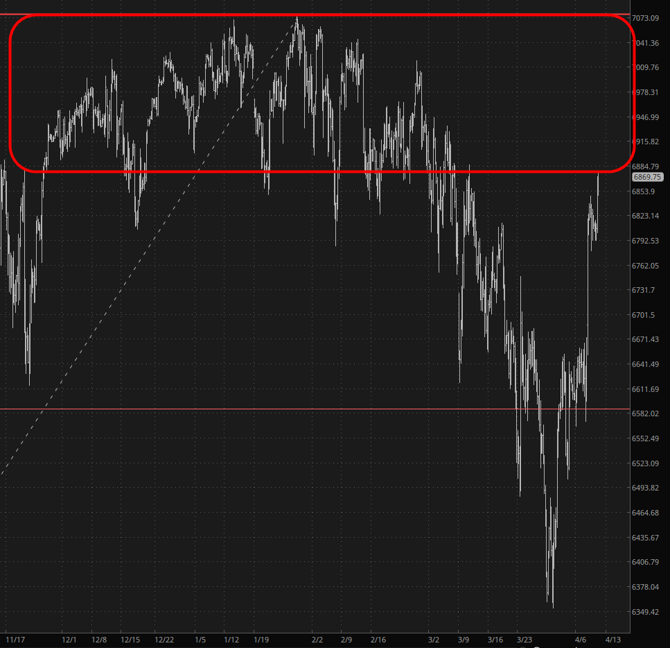 The past couple of days have sent the /ES deep into enemy territory, and at this point there is a Hadrian’s Wall of resistance in the form of months of price activity grinding around from around 6880 to 7080 (about a three-hundred-point range of molasses-thick resistance).