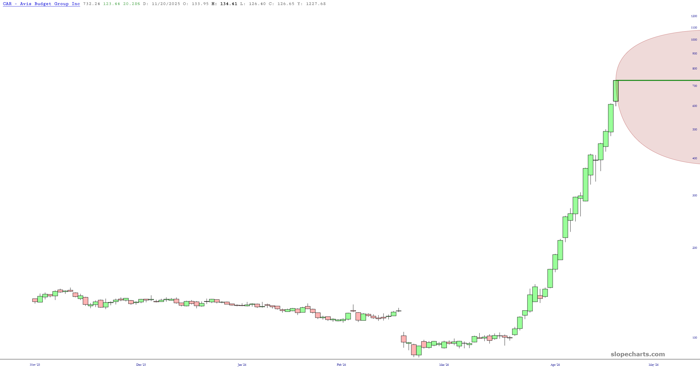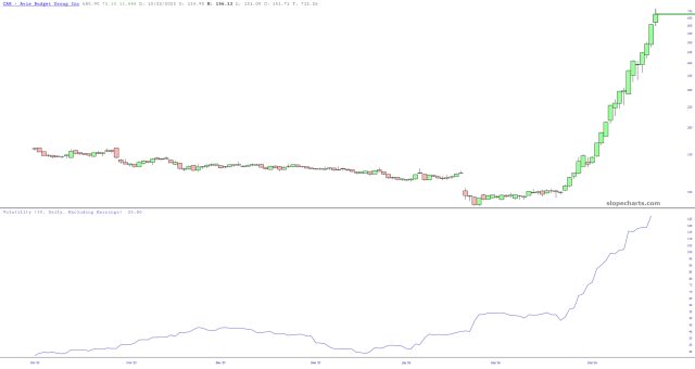 I was reading up on it this morning, and even though everyone knows the stock is doomed to crash at some point, no one knows what that “point” is. SlopeCharts has a wide variety of options tools, and one look at something as simple as the 30-day implied volatility tells the story: we’re deep intro triple-digit land.