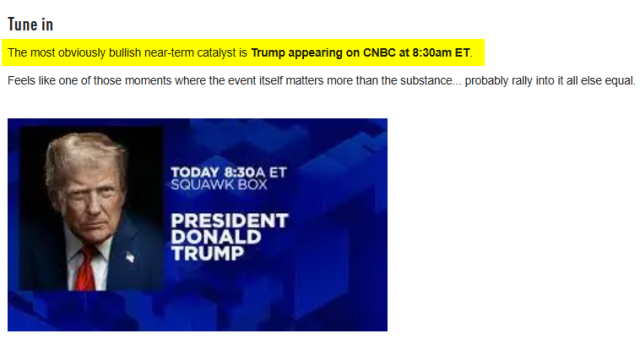 Good morning, everyone. With the ceasefire ending tomorrow, everyone’s on the edge of their seat about What’s Next. In the meanwhile, the big event everyone was excited about was the President showing up on CNBC an hour before the opening bell this morning.
