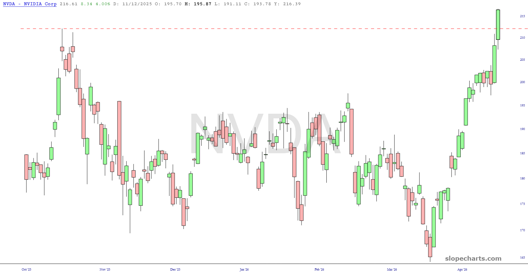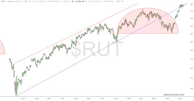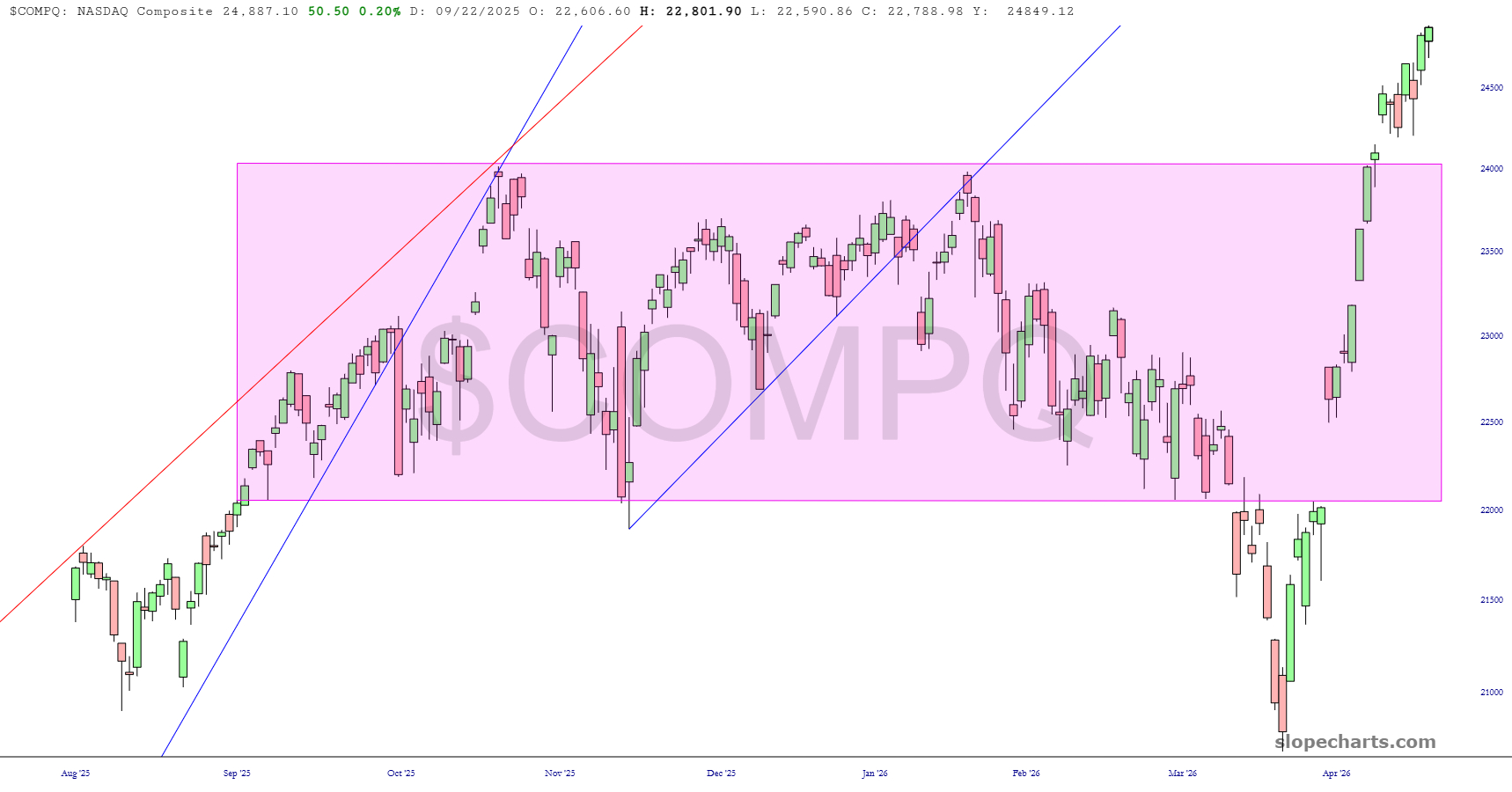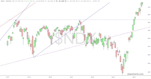 Although it isn’t an index chart, I wanted to share Nvidia’s, since it broke out of a range it has been trapped in for about ten months. NVDA is far and away the most valuable company on the planet, and if the AI Fever ever, ever breaks, you’re going to see a wipeout that makes the Great Financial Crisis look like an episode of Mister Rogers’ Neighborhood.