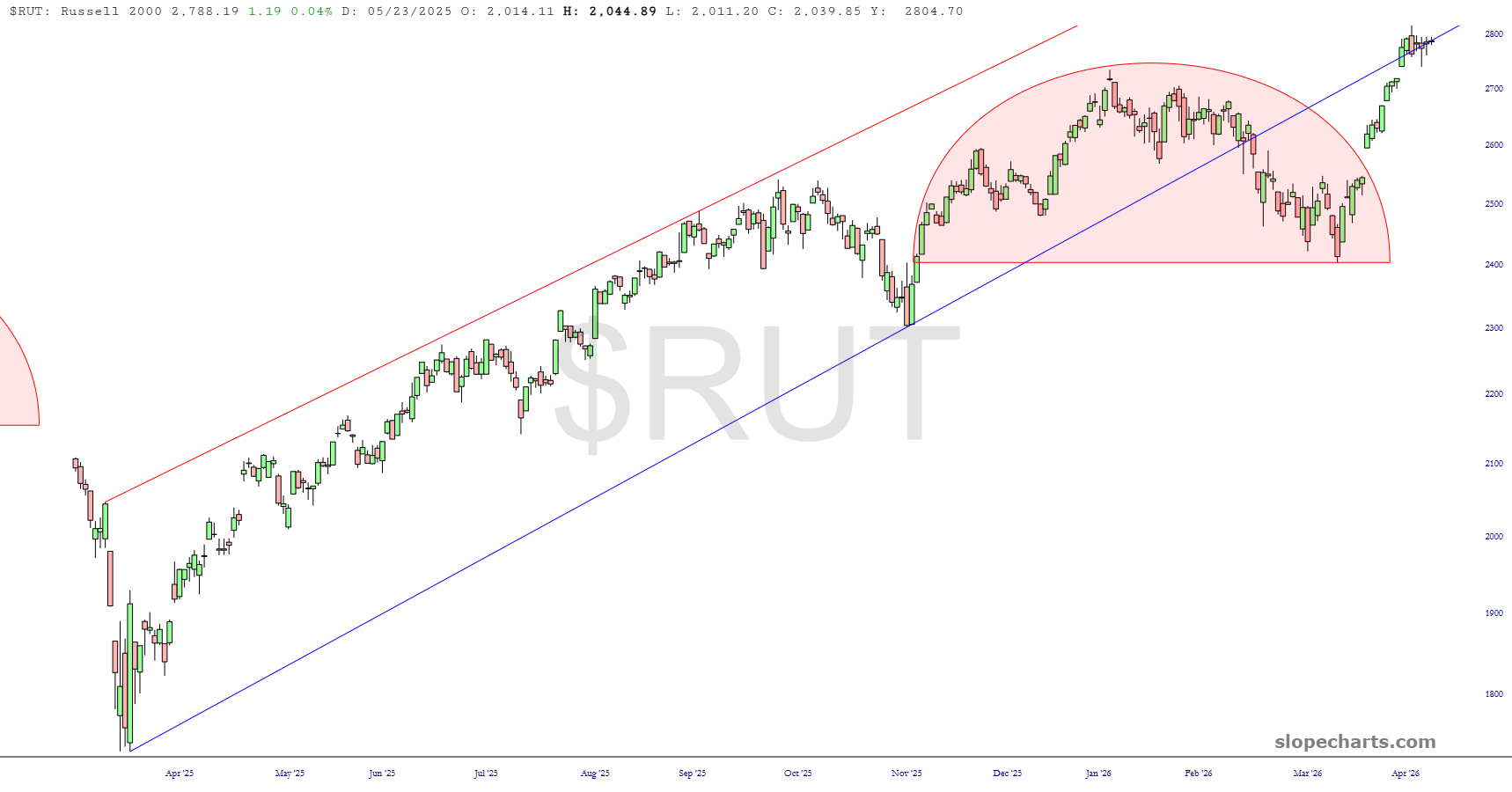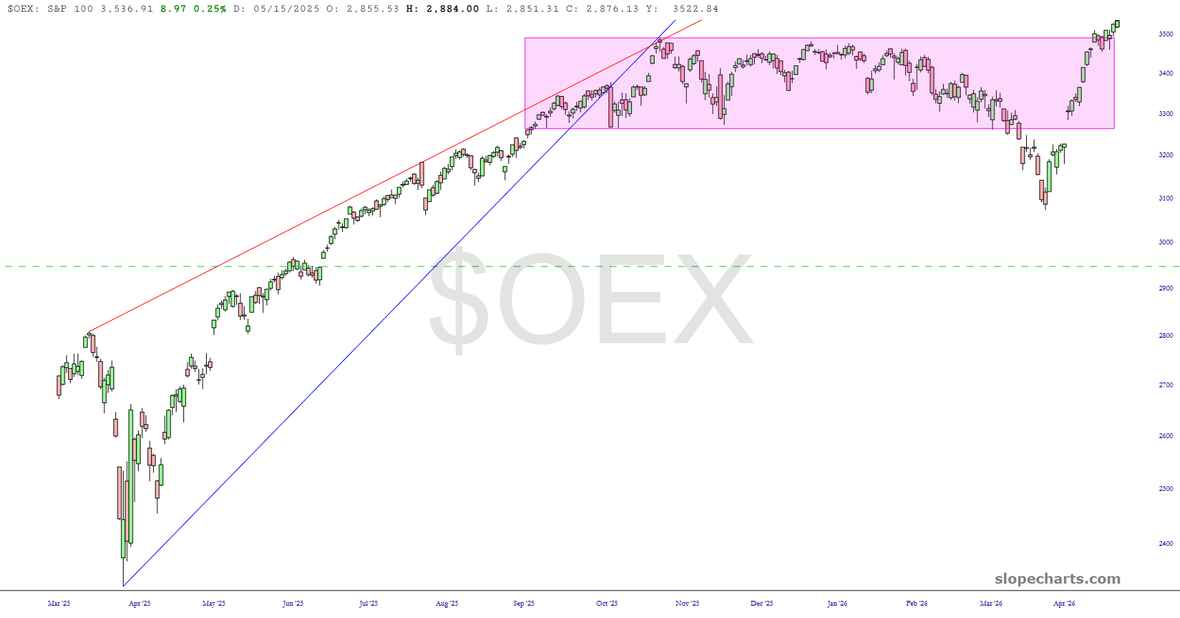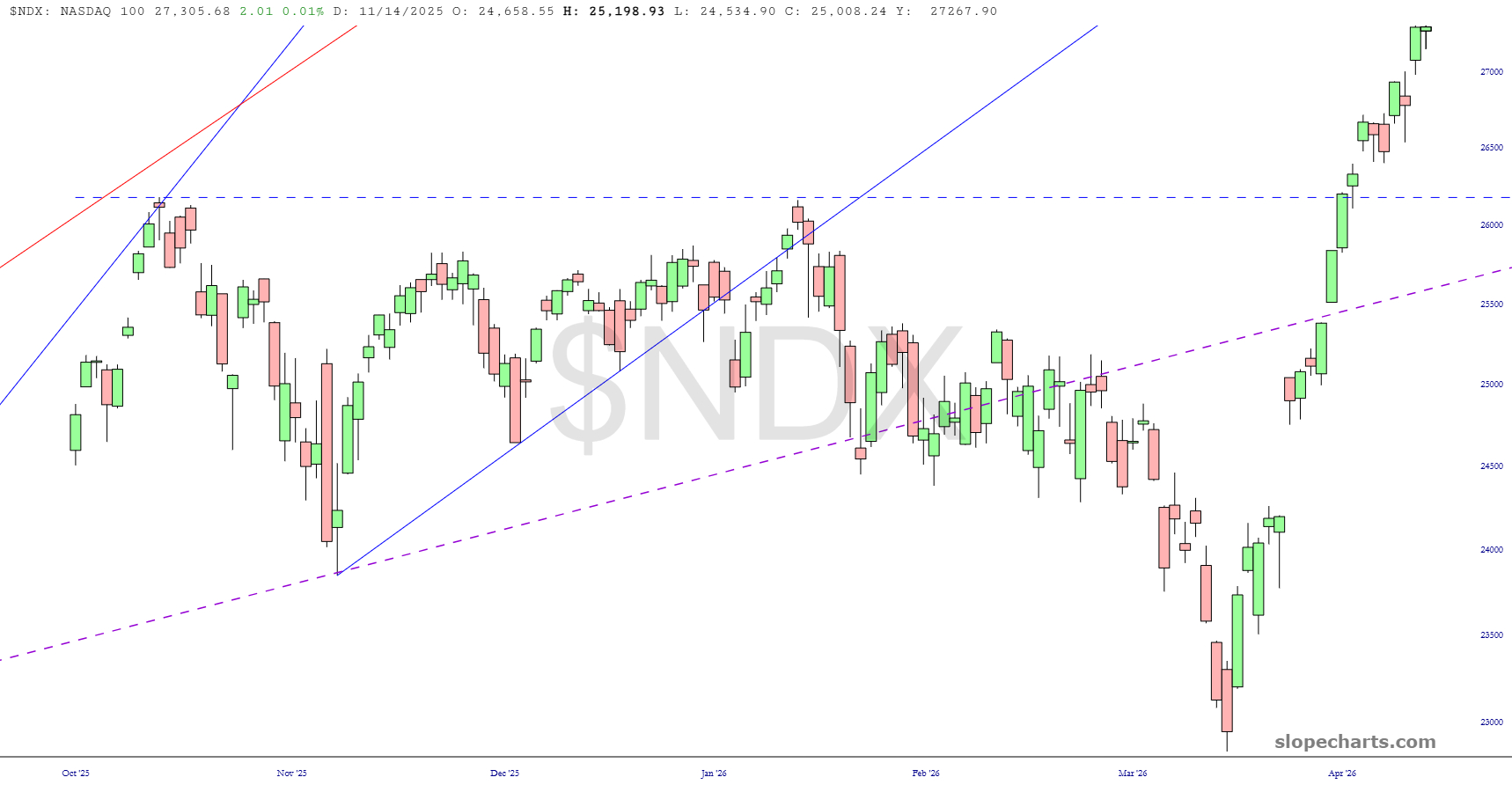 Although it isn’t an index chart, I wanted to share Nvidia’s, since it broke out of a range it has been trapped in for about ten months. NVDA is far and away the most valuable company on the planet, and if the AI Fever ever, ever breaks, you’re going to see a wipeout that makes the Great Financial Crisis look like an episode of Mister Rogers’ Neighborhood.