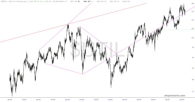 There are a couple of big indexes which seem to have glued themselves to their trendlines, suggesting some kind of stasis or equilibrium. Here we have the Dow Utility Index, which would put a school bus of ADHD kids to sleep.