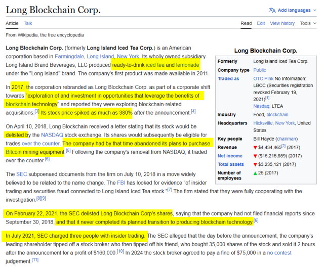 I direct your attention to the former maker of iced tea and lemonade (Long Island Iced Tea Corp.) which did exactly the same stunt with Bitcoin about nine years ago. I’ve highlighted some salient portions.