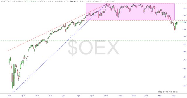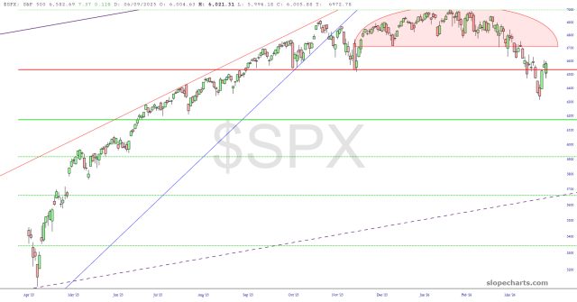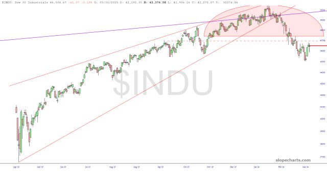 One last look at the S&P, but closer this time, illustrates the reversal top more plainly. Generally speaking, yes, we can tolerate a little more upside if necessary, surely driven by some silly pledge or promise related to the war, but generally speaking, we reallllllllllly need to start falling soon, folks.