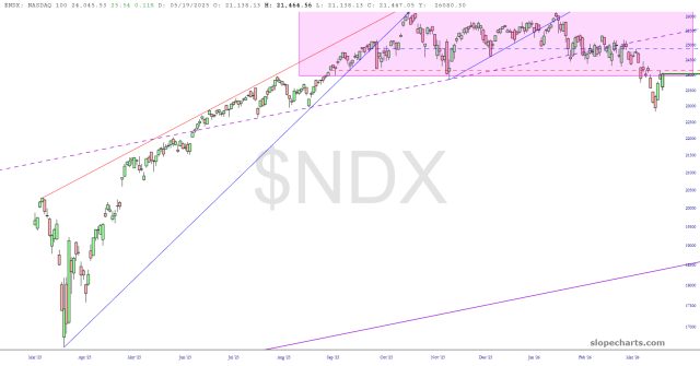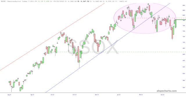 I continue to be obsessed with the semiconductor index and my trade on that consists of puts against the SOXL, which is the leveraged long ETF. As for the index itself, it has a beautiful diamond pattern which, just like every other freakin’ thing, was challenged to a strong counter-trend push last week.