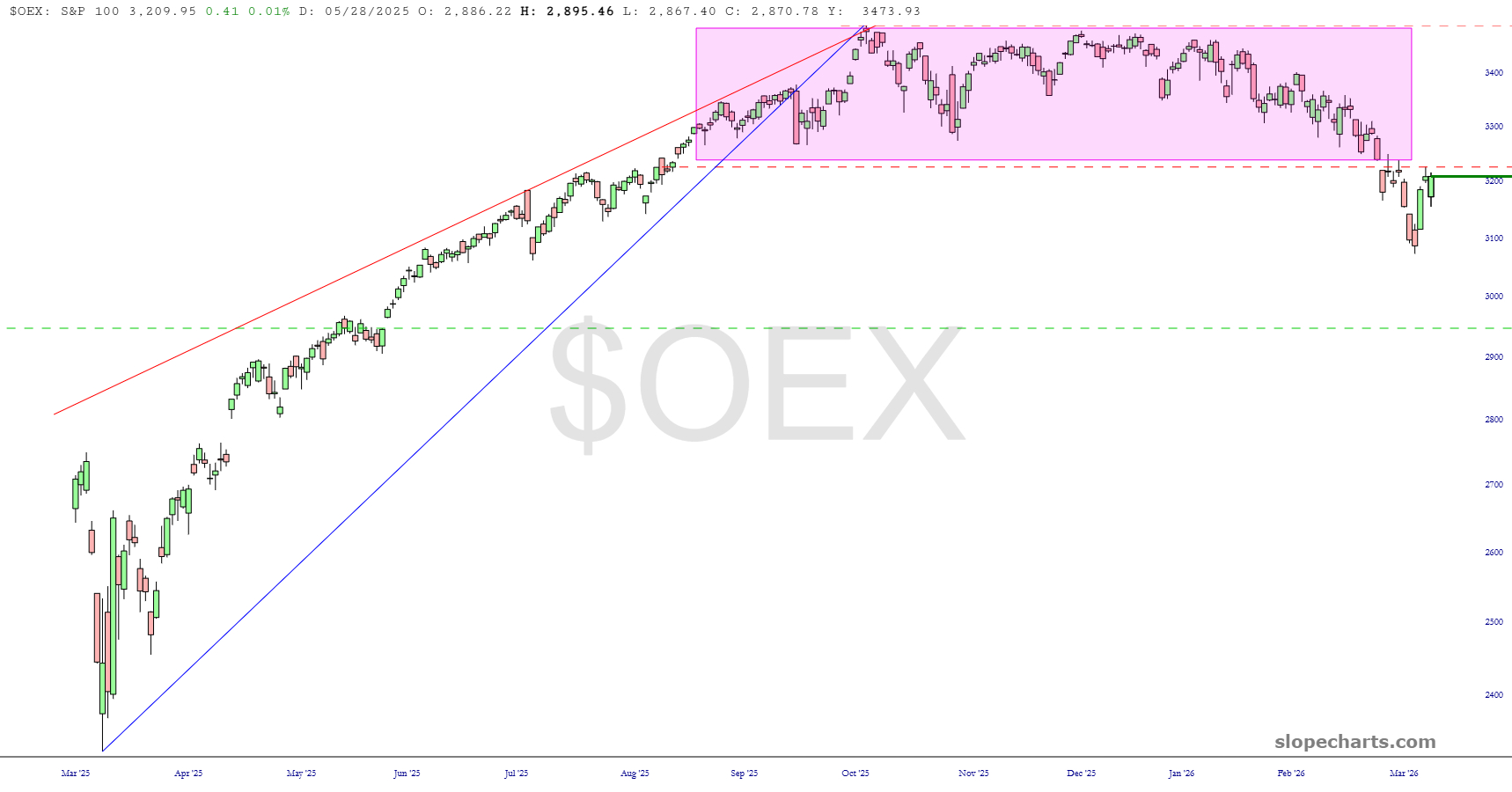 The S&P 100 cash index – – same deal – – sorry to be so repetitive, but honestly, the market is POISED to fall hard, and it sure had better!!