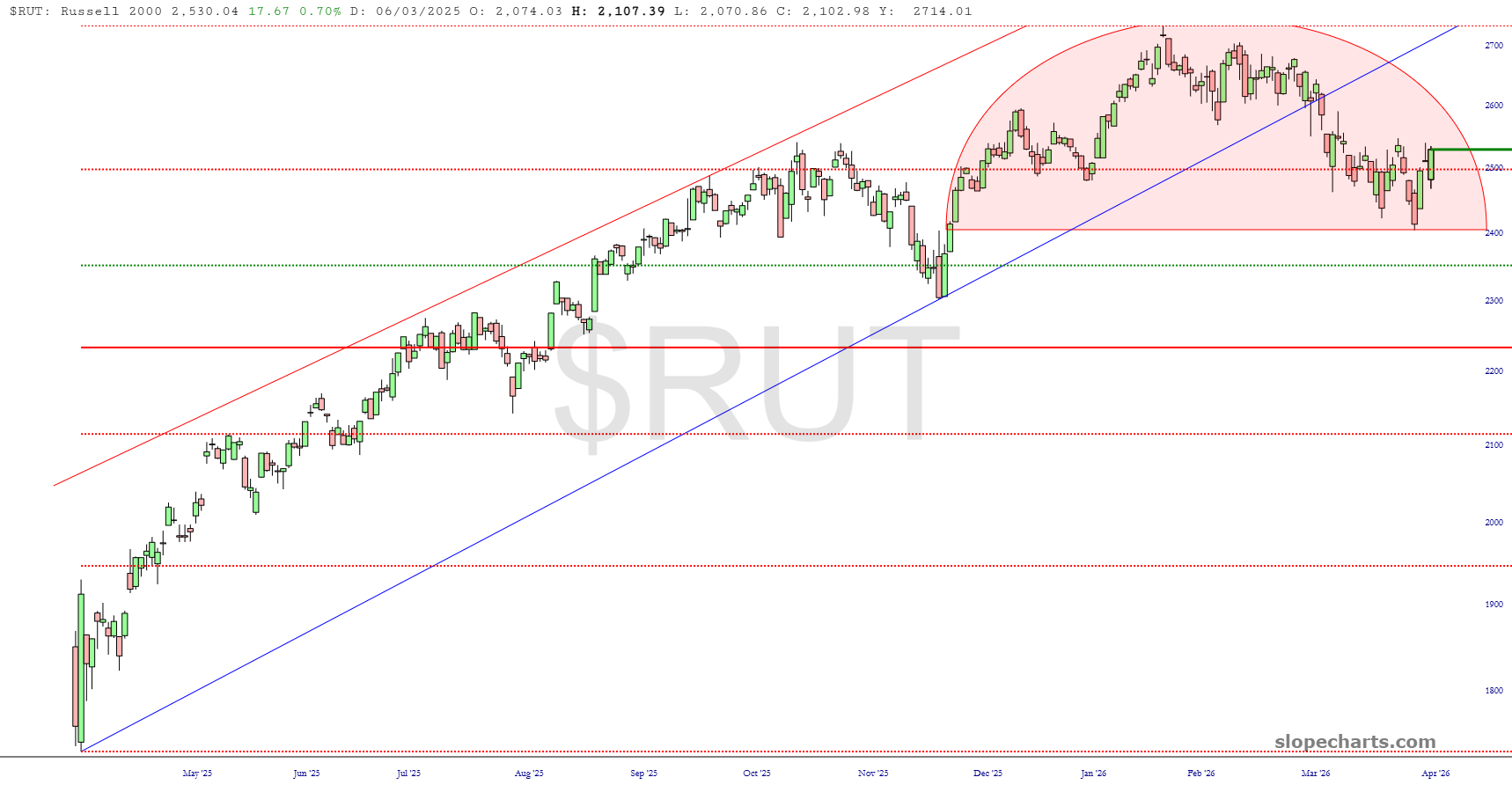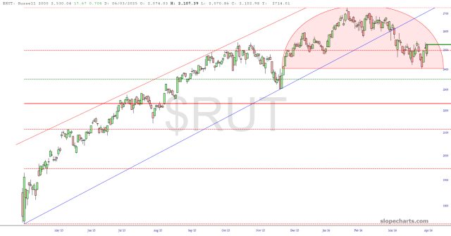 I’ve got good news and bad news on the Russell 2000. The good news is that it is sporting an absolutely fantastic, picture-perfect head and shoulders top. The bad news is that it isn’t quite complete, although it’s getting there. Fingers crossed, right?