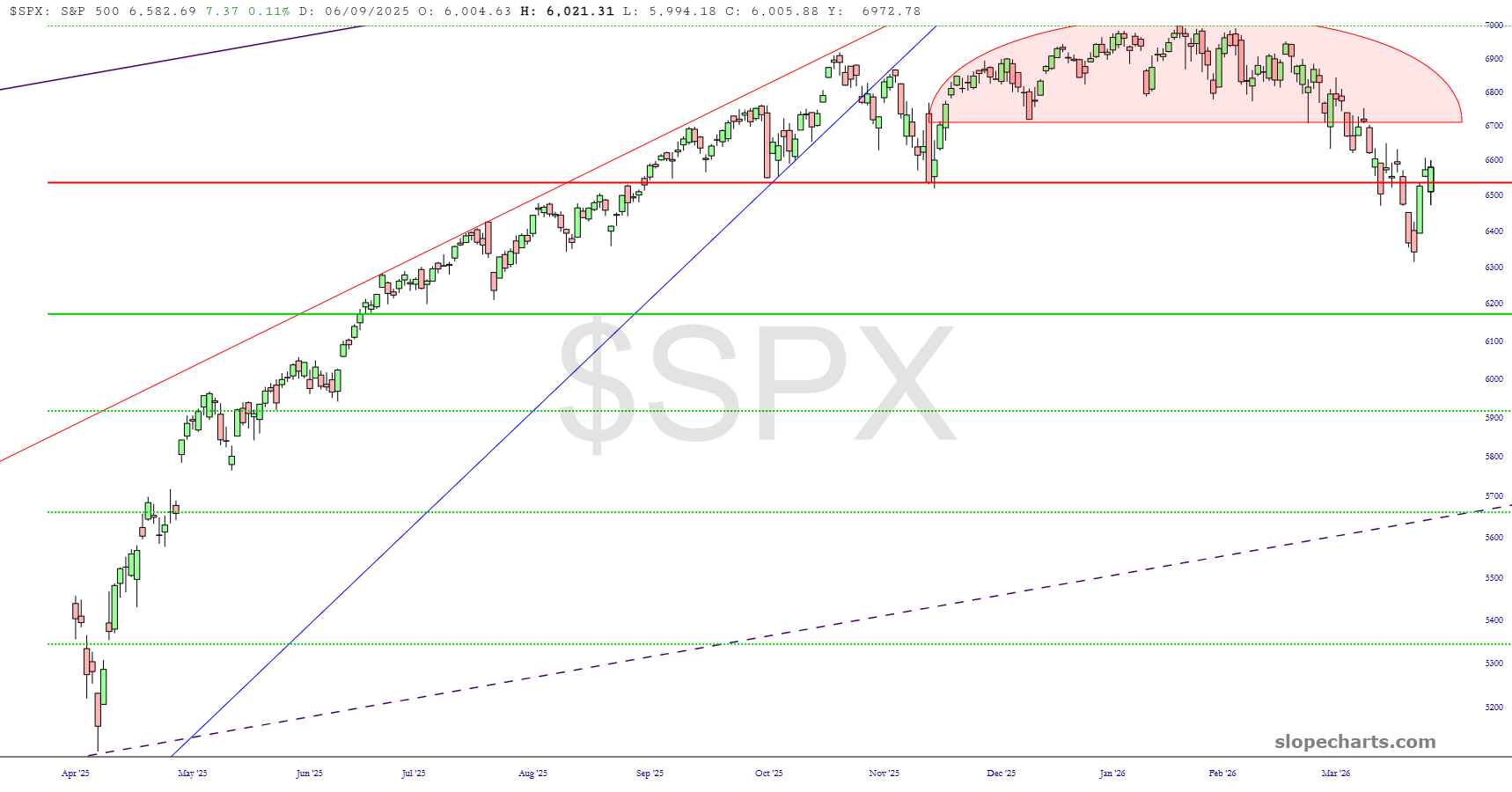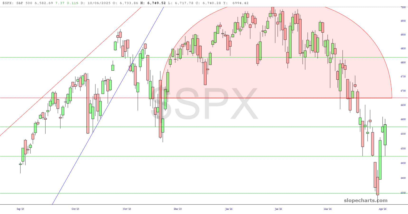 I’ve been writing about the S&P and its Fibonacci relationships lately. You can see those drawn here, and we’re basically hanging out at the 23.6% level right now. A strong downward push could get us to about 6100 or so on the cash index.