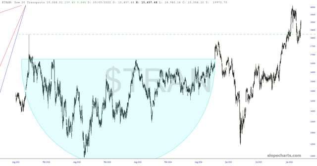 Weirdly – – because, honestly, this makes ZERO sense – – the Transportation index seems not to care, even though one would figure they’d be getting mauled by this expense increase. Are they so savvy hedging with futures that it hasn’t mattered?