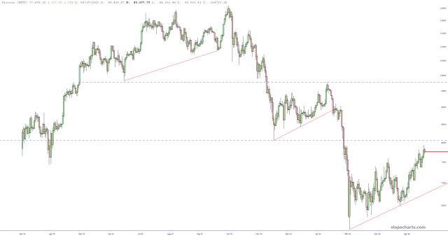 I’ll say it for the fiftieth time, though: keep your eye on Bitcoin! This, to me, is more important than any index chart, even though it ostensibly is irrelevant to equities. I am going to start building my BITI (inverse Bitcoin) position today and will add to it day by day.