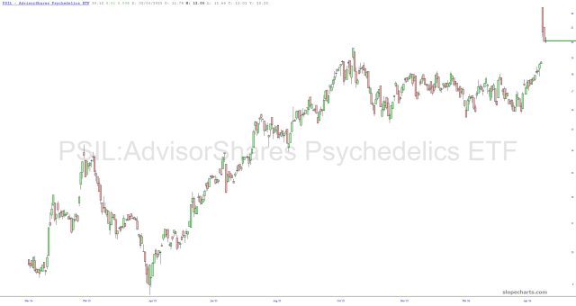 Perhaps you heard that last weekend the President signed an executive order to allow for the use of psychedelic drug therapy (I suppose for veterans, but I’m not sure of the particulars). Below are five publicly traded instruments which are in this sector: