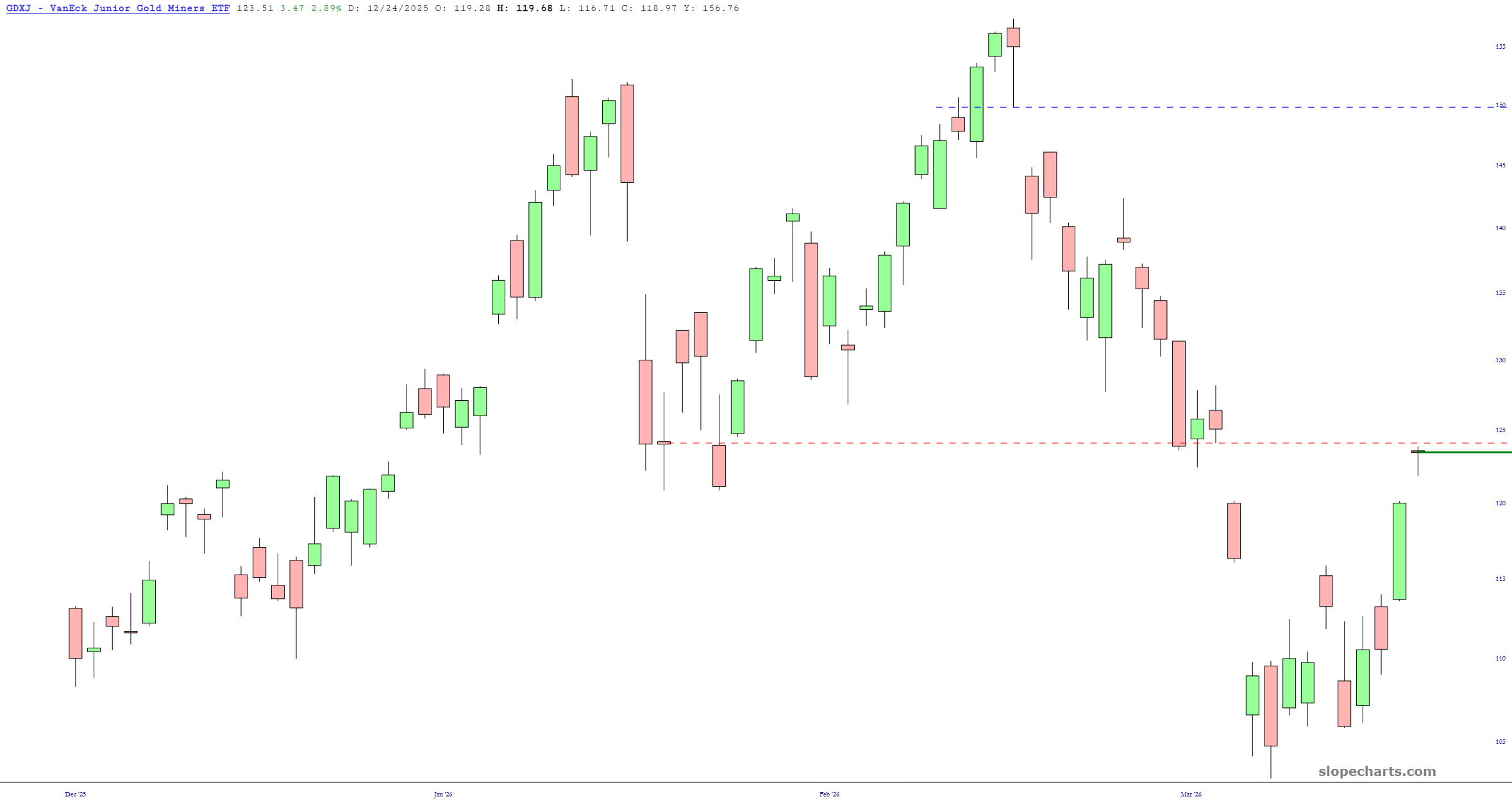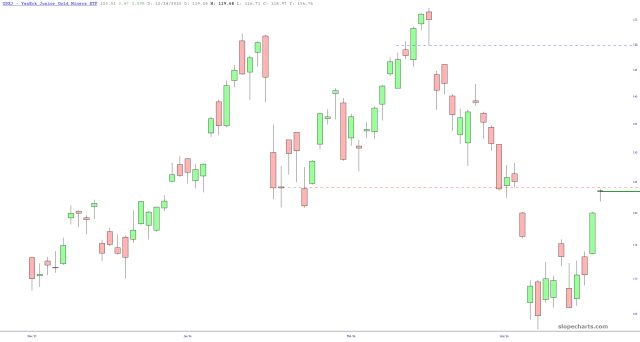 I believe precious metals miners are close to exhaustion, such as GDX and GDXJ, shown below. I’ve shorted the first one with a stop-loss price of 96.20.