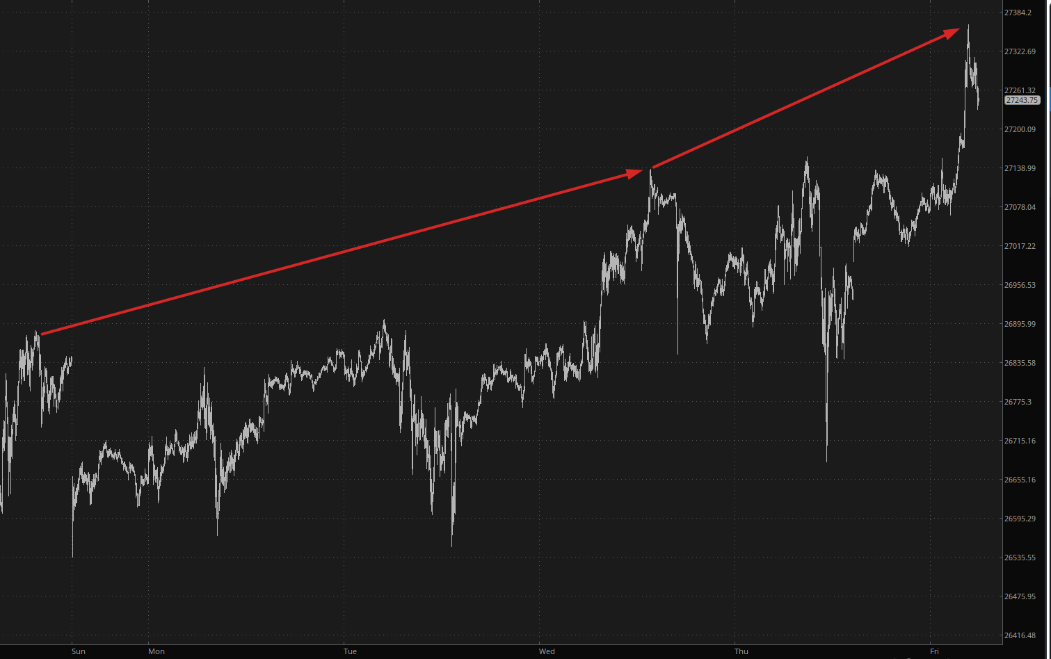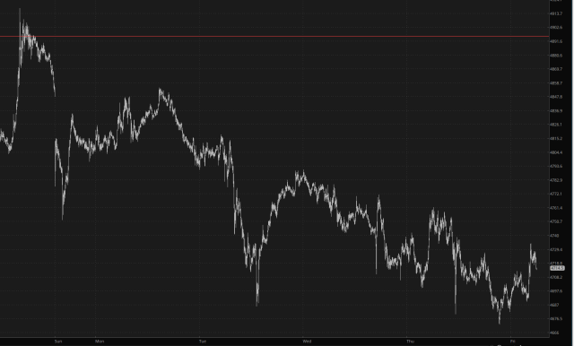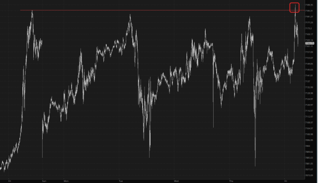 For an entire week, the /ES has been trying to break out. It finally managed to do so this morning, for a minute or two. Now we’re back into the same wild range we’ve been cycling through for five days.