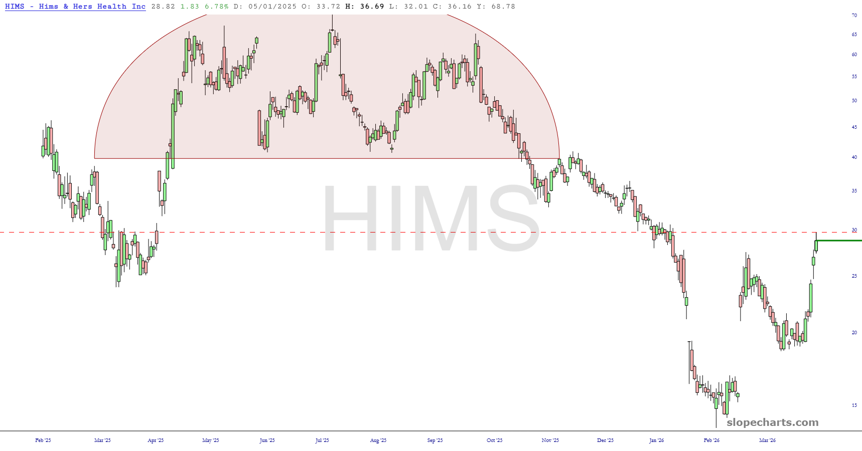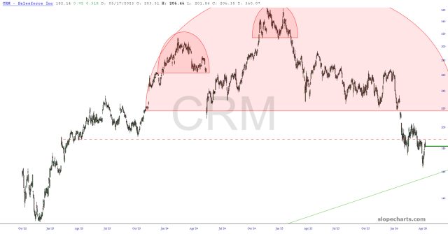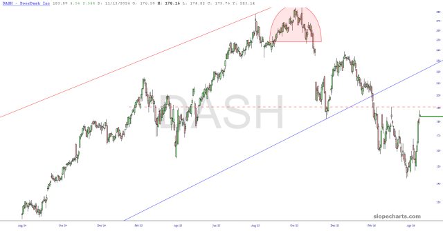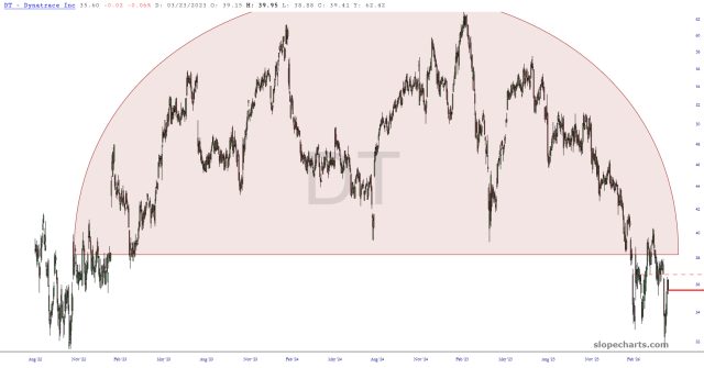 April has been absolute murder for the bears, and I’m not sure I should even use the plural of that noun anymore since I’m not sure anyone besides me is loopy enough to still be short. Anyway, below are the first portion of the seventeen, most of which were new entries to take advantage of Friday’s mega-rally. As always, I have zoomed in on the most salient portions and show the stop-loss with a dashed red line.