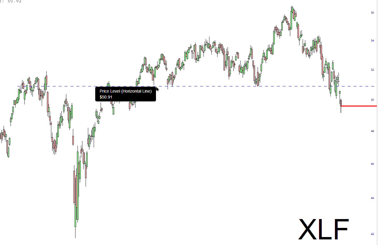 The ETF representing the financial stocks has completed a clean top with a well-defined gap at 50.91: