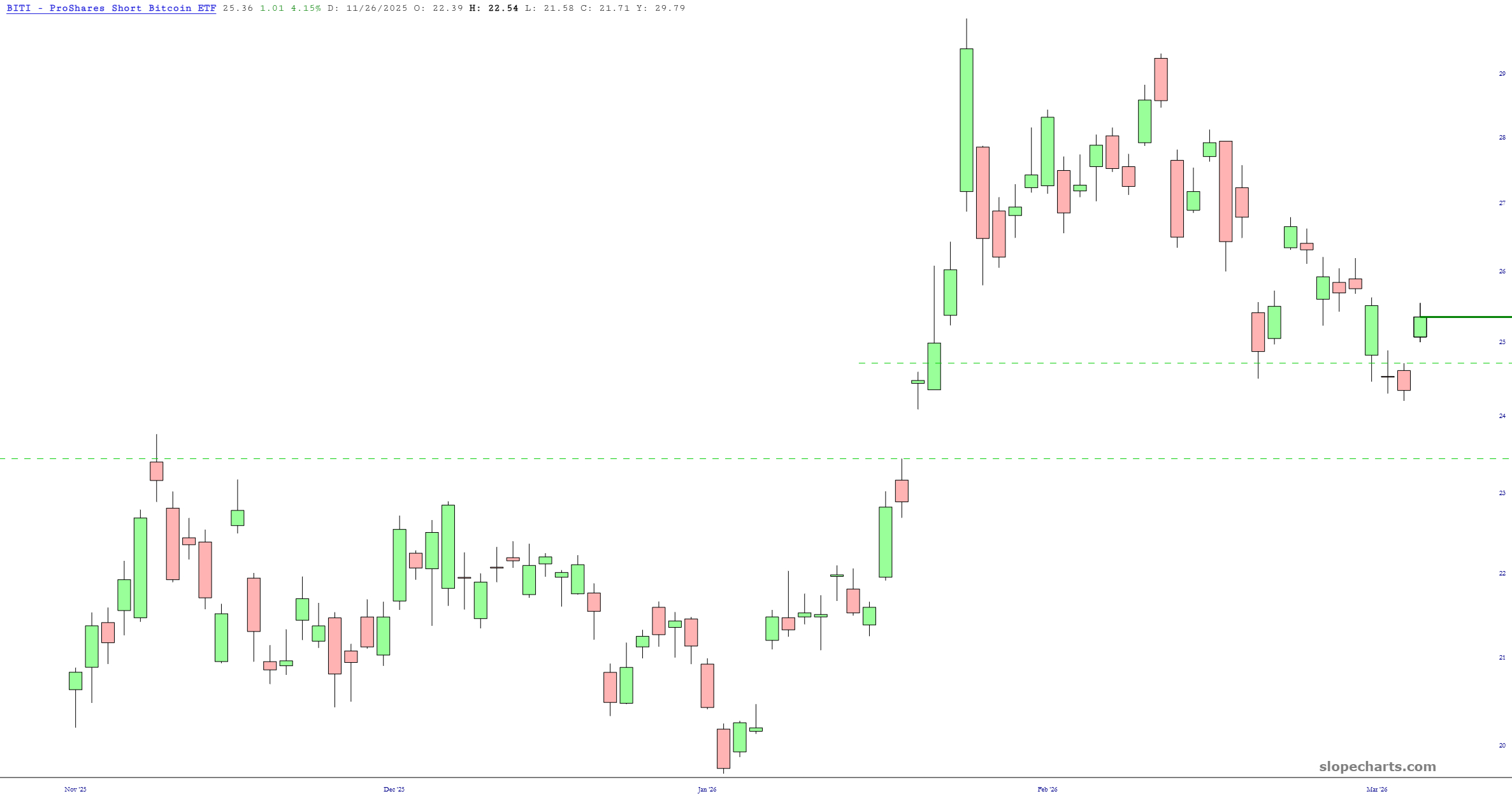 Yesterday I went long BITI in order to take advantage of Bitcoin’s projected drop. This investment has worked out well over the long course of its one-day tenure.