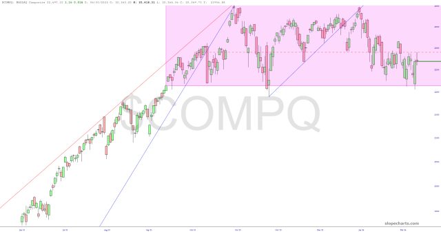 I have composed these before Friday’s open, but it’s worth checking out the state of the big indexes. They fall into two general camps. The first one is represented by the four charts below, and they share these characteristics: