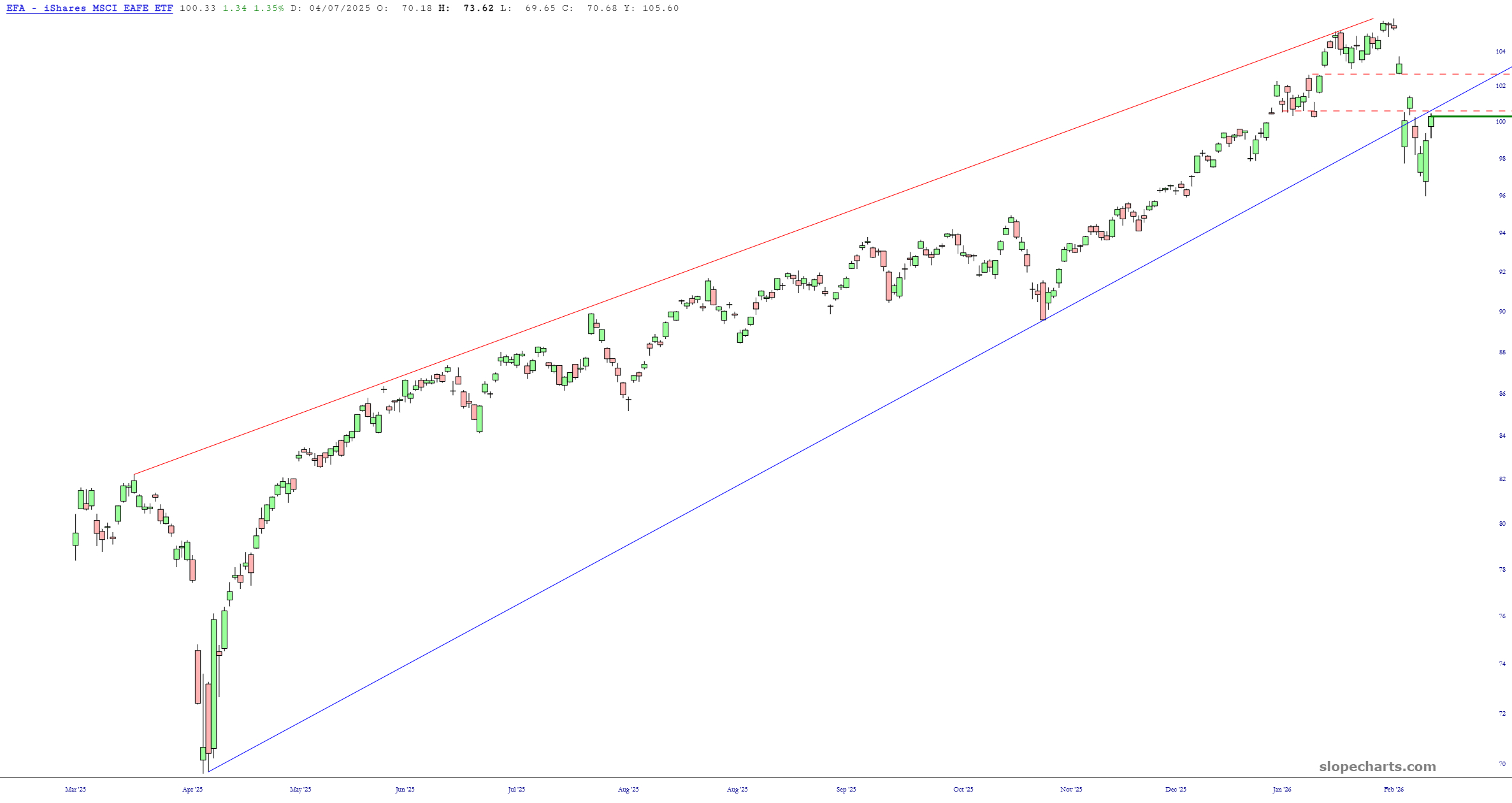 Below is the EFA, which was neatly within a wedge for a full twelve months. The outbreak of war caused prices to break, for the first time, the ascending supporting trendline, and the ill-conceived rally yesterday and today has brought it back to the underbelly of the broken trendline. The bounce may well be over right about here.
