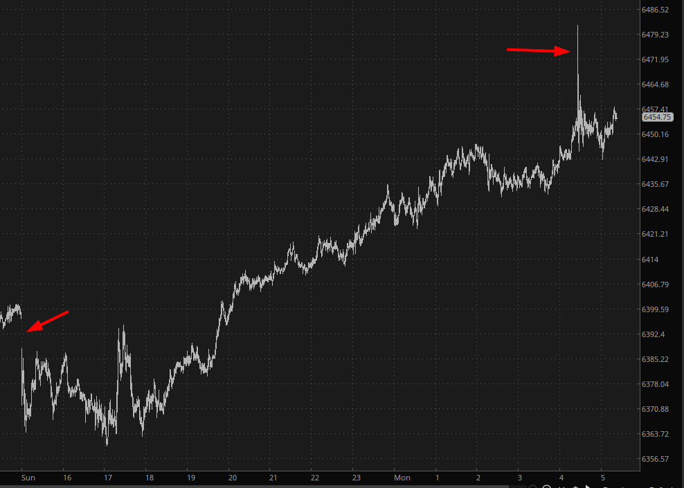 I was bracing myself all night long for the Monday Morning Lie, traumatized as I was by what happened precisely one week ago. On Sunday, the market gapped down fairly hard (left arrow) but then spent all night long climbing. Finally, once again a couple of hours before the opening bell, the Pre-Market Fib was launched, and the market spiked (right arrow).