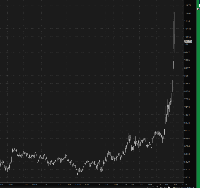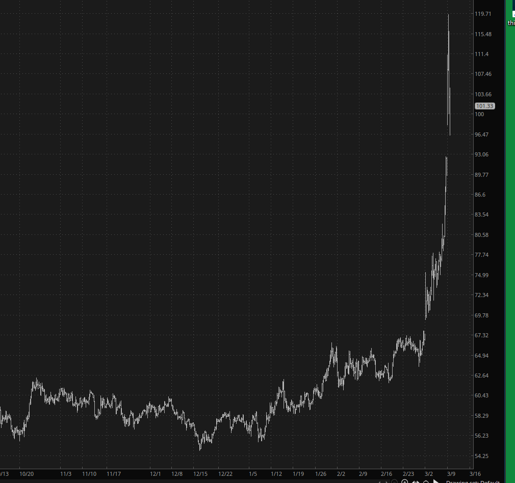 As is so often the case with thrilling Sunday night action, by the time we wake up to see what Monday holds, the movement is wholly or partly gone. For example, crude oil last night was on an absolute tear, moving up to about $120:
