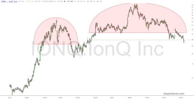 Remember how white-hot quantum computing stocks used to be? They’ve all lost about two-thirds to three-quarters of their peak value. I believe they have a lot farther to go, although I am only short the first of these, IONQ. Here are the four most interesting ones: