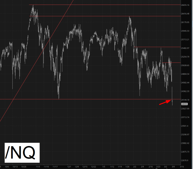 Look, all I ask for at this point is that things keep falling to pieces until at least Monday’s open. The reason is that – -and this is TOTALLY uncharacteristic of me – – I bought a ton of $575 SPY puts that expire on Monday. Again, I never do this kind of thing, but as of this moment I’m looking at a 300% profit on them, and I’ll be pissed beyond measure if I wake up and find out that, I dunno, Trump has TACO’d out somehow and stopped the bleeding. As I stand here now, however, the market is falling to pieces, and crucial support has been broken.