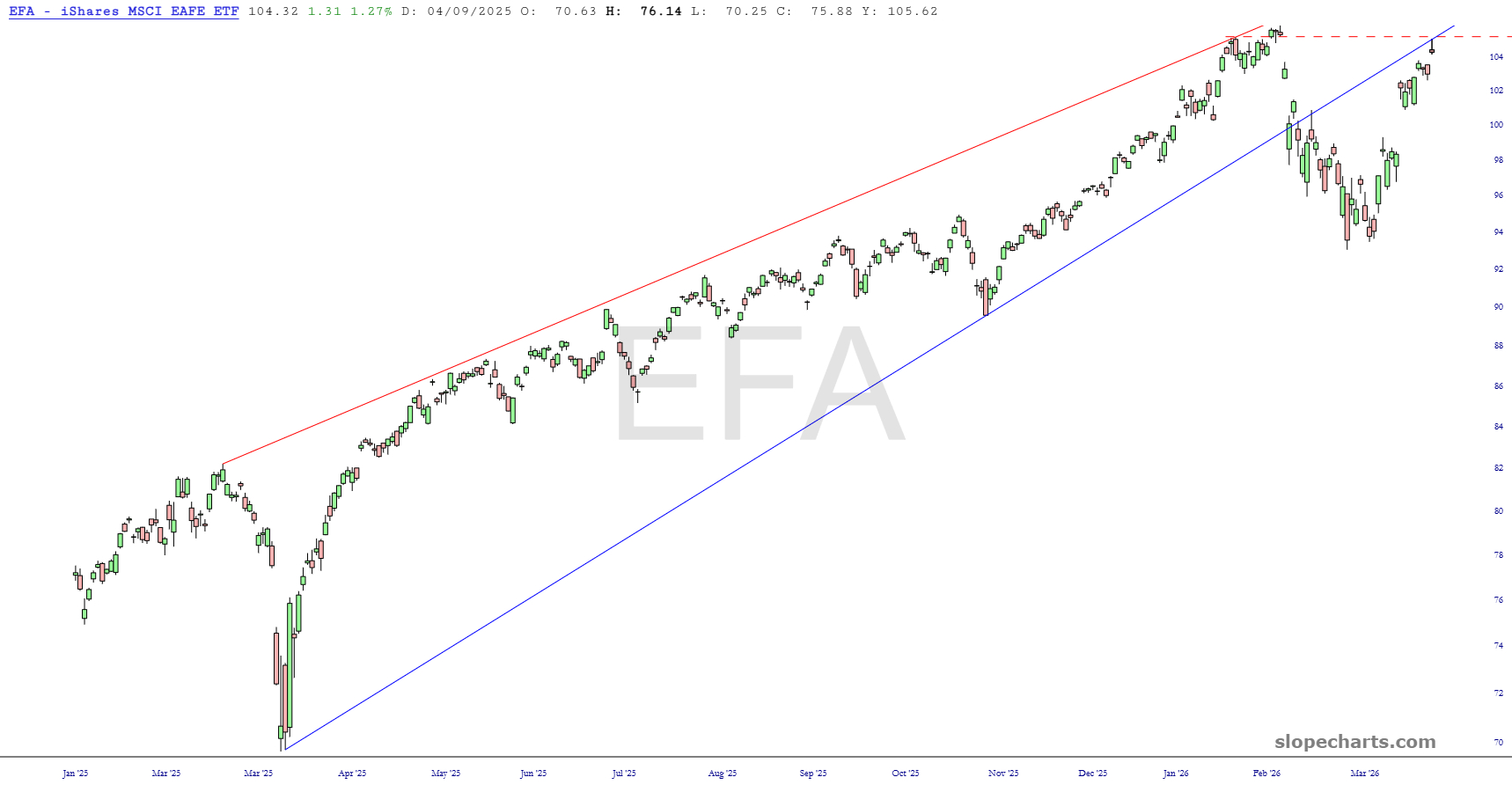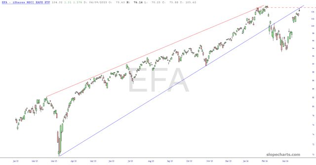 First up is EFA, which I am short. There are three exceptionally cool things about this chart. First, Friday’s action formed a beautiful shooting star reversal pattern. Second, the price peak on Friday was precisely below the broken trendline. Third, the price peak also came deliciously close to an important price gap. This is just a dynamite combination.