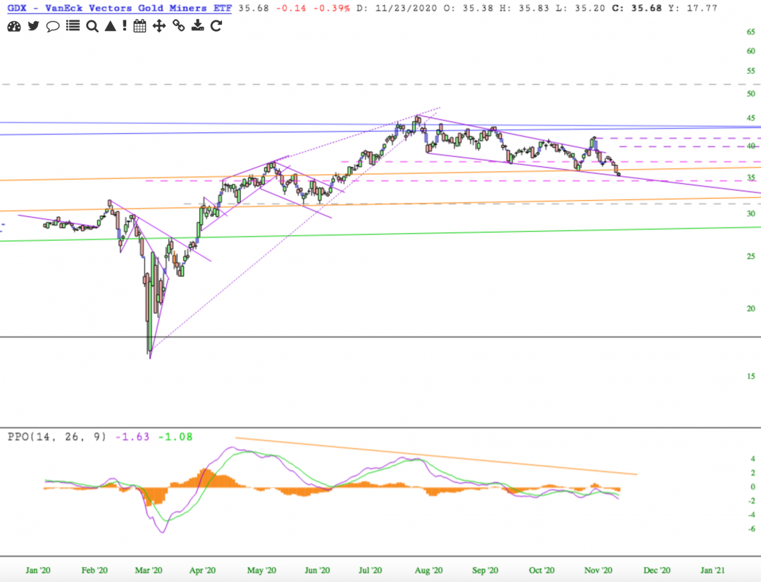 GDX holding the down trendline today but negative divergence persists.