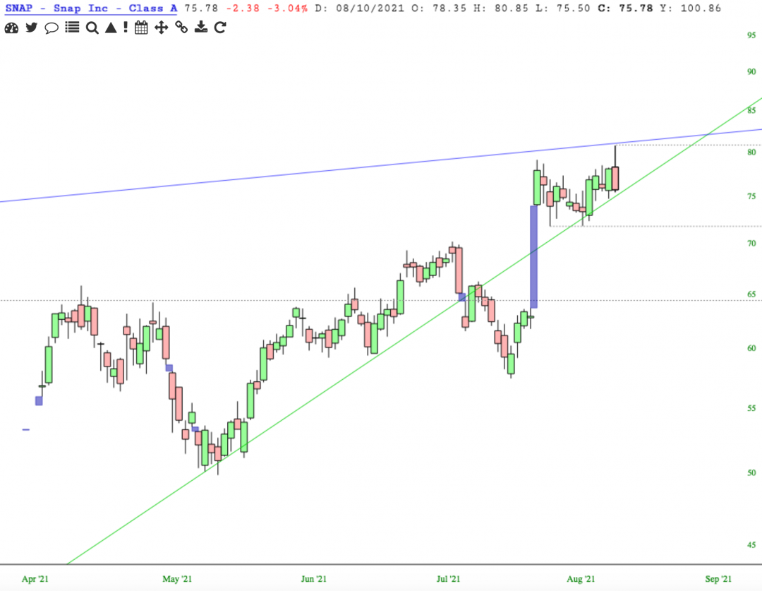 SNAP pressed between resistance from 2017 IPO and support of Mar 2020 uptrend. Now an island cluster that could prove to be a reversal.