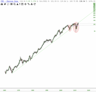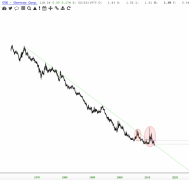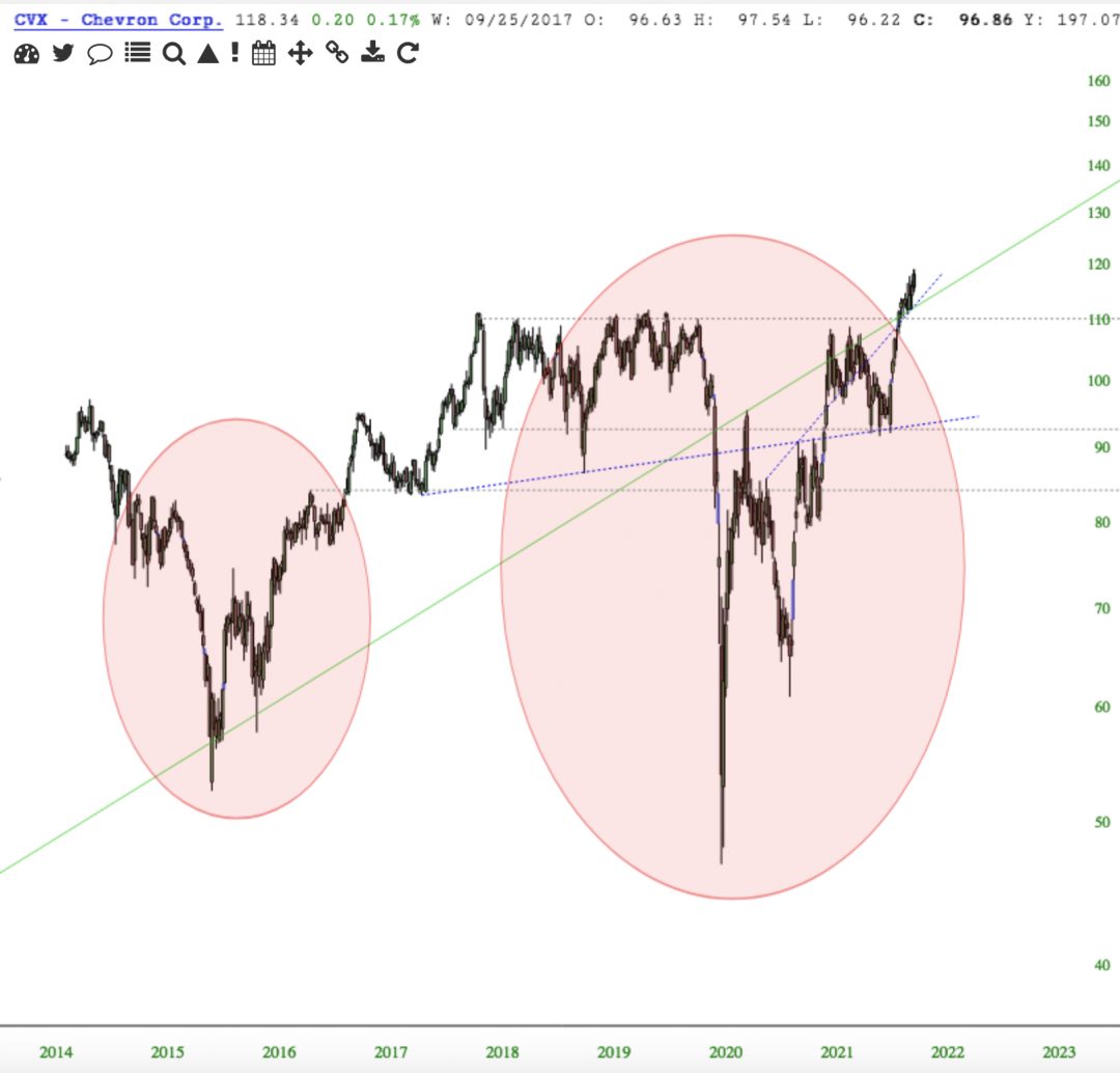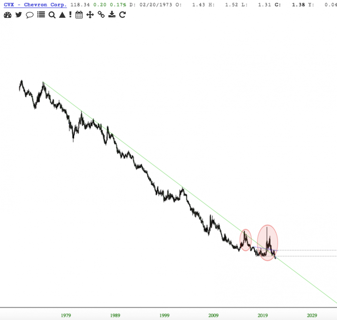 Green downtrend line is from 1974 on inverted CVX daily chart.