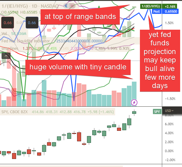 credit inverted shows interesting near upper limit bands, with huge volume, but tiny candle, yet fed funds projects bull still has money to play with for few more days
