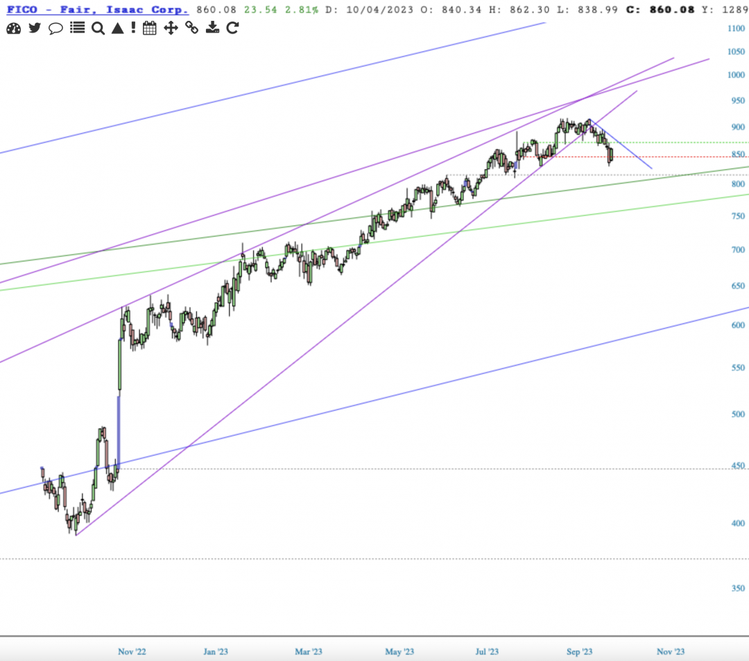 FICO suffered a break down of a bearish rising wedge in Sept '23.