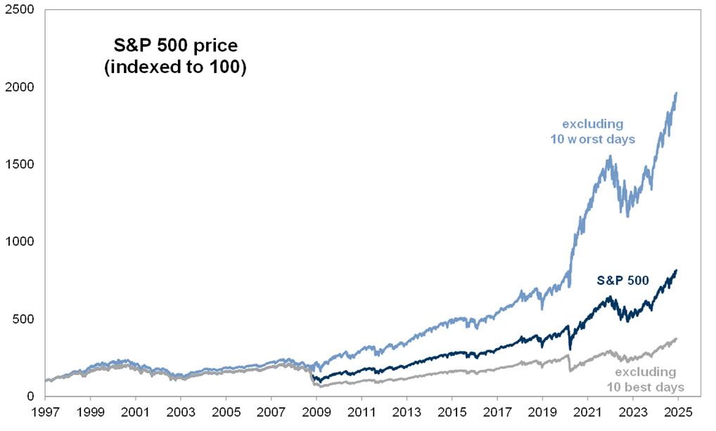 one should NOT try to time the markets, as missing the ten BEST days is a serious drag on returns (gray line).