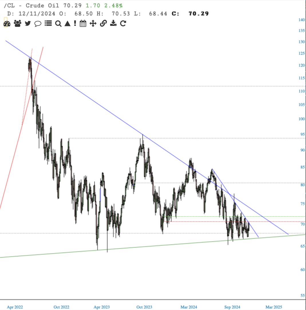 /CL riding the bottom of a triangle since leaving its double top over two years ago.