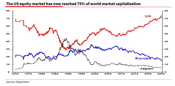 US equity market now comprises an insane 75% of the MSCI World Index.