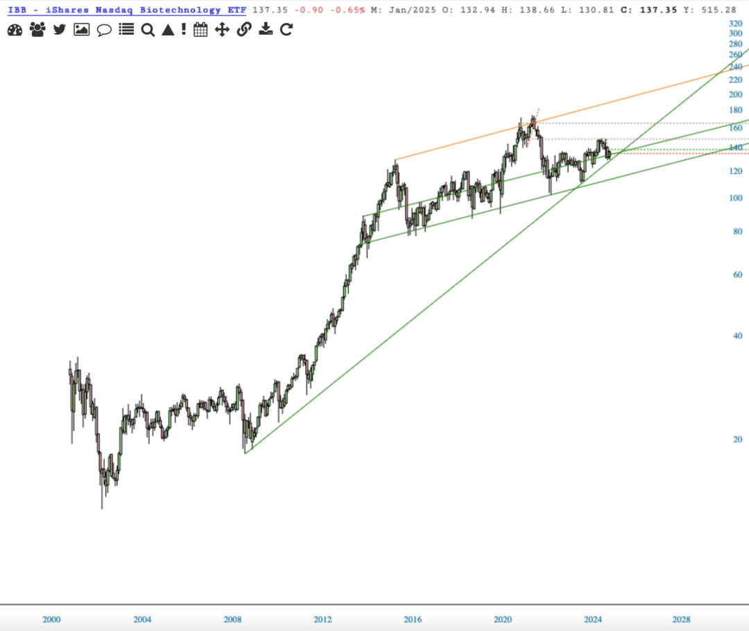 IBB is staging a comeback from a triple-top drop last November and the chart looks bullish.