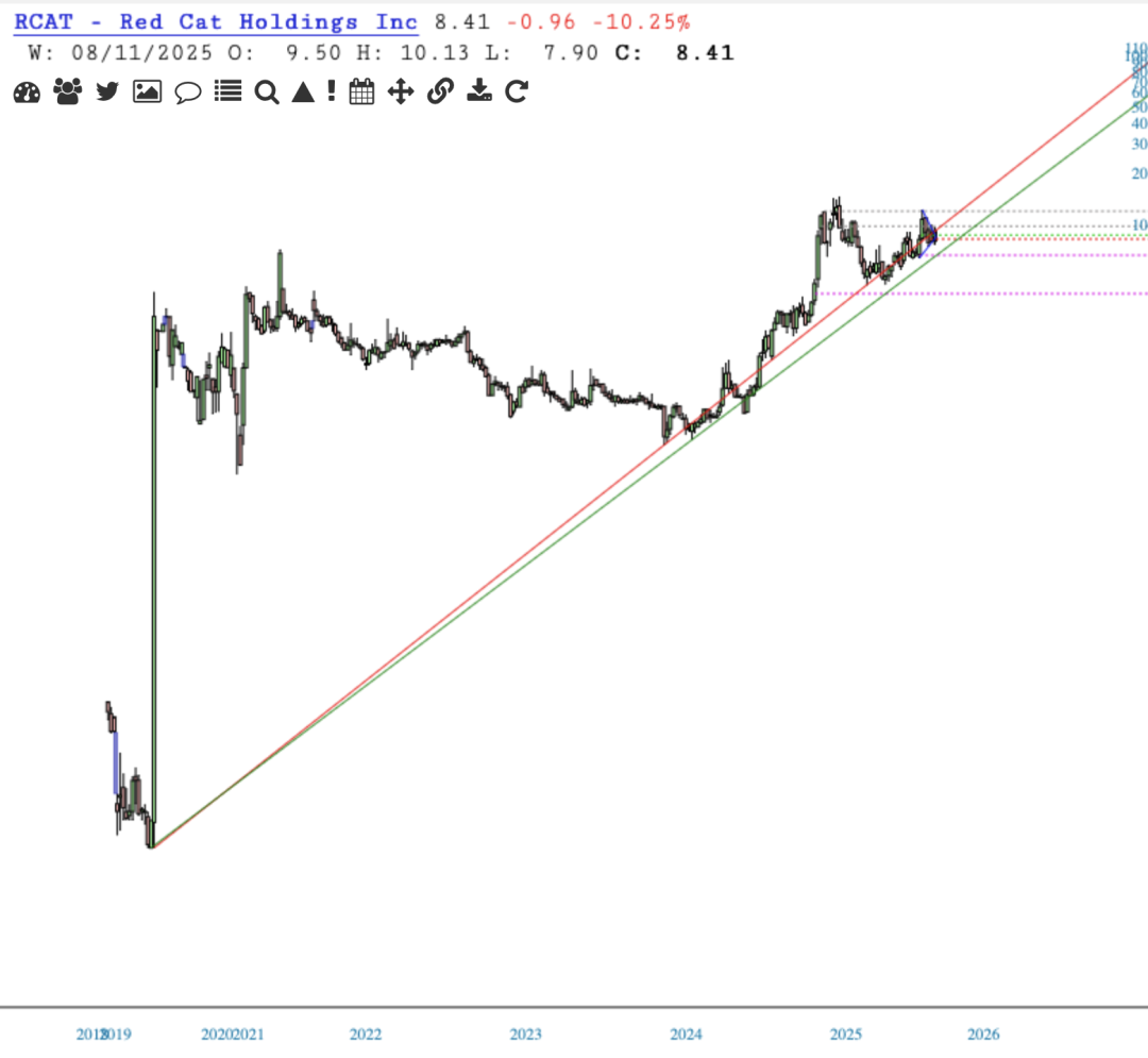 Drone tech company, RCAT, price has fallen out of the triangle and below the Cloud.