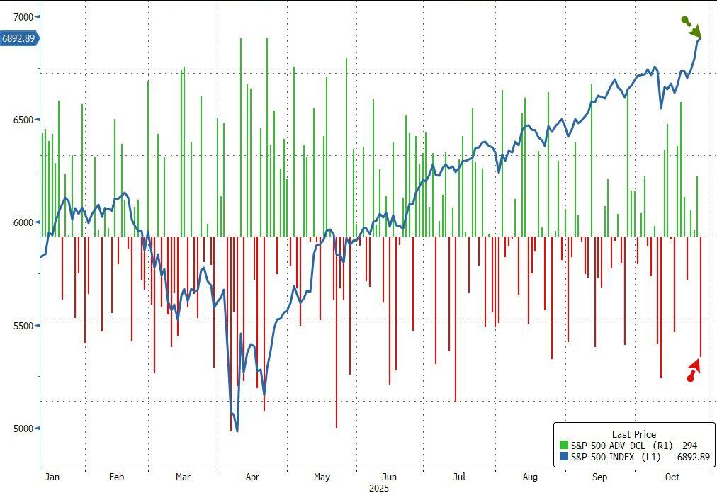S&P all time high will make the history books: it will happen with the most negative market breadth at an ATH on record.