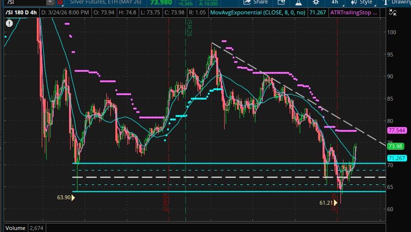 @Violet When I made my previous call that silver may have put in a generational bottom at that one Thursday nite overnite low of 63.90, I knew in my heart of hearts that silver could do one more stop run below. And there it is. The stops below have been run, the 4H wick has been thoroughly worked over and now we have our sights set for the downtrend line above. So put up your trays, lift your seatbacks and make sure items are properly stowed. Silver is ready for take-off!