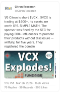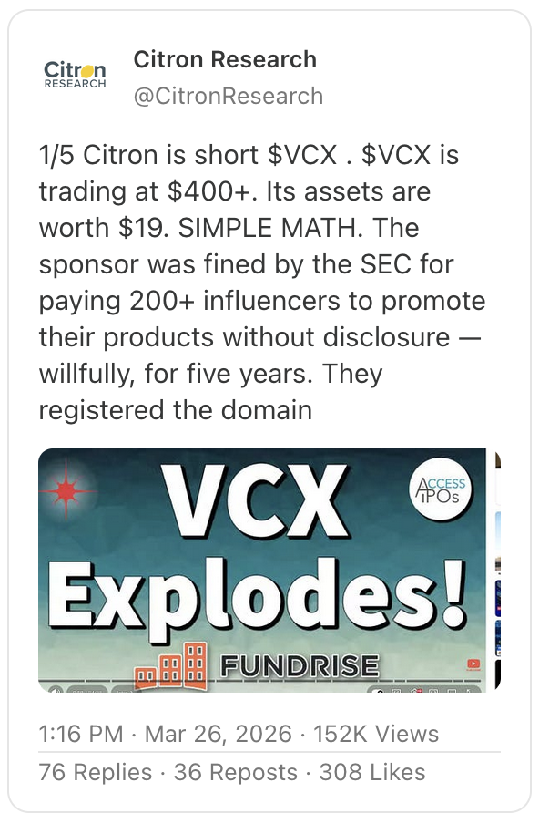 Citron Research tweeted critically on Fundrise Innovation Fund, LLC (NYSE: VCX — $4.90 billion), a publicly traded closed-end fund investing in private tech companies. Citron raised concerns about the fund’s large premium to NAV and promotion by social media influencers.