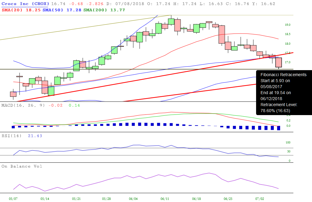 $CROX appears to have broken a steep trendline and could be moving down to a less steep trendline. At the very least down to the nearest Fibonacci level at 16.63ish.