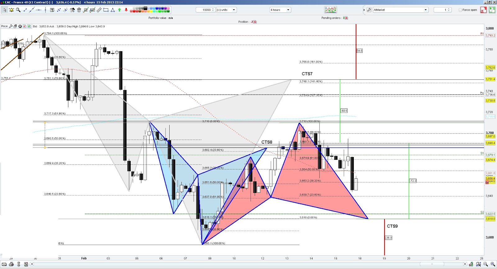 Being predominantly pattern trader current market conditions are keeping me busy in multiple markets from watch list. To recap the last week setups i had immediate loser on ALSI40 trend continuation setup as well as two fills on advanced patterns that look more promising as it stands for now. French CAC40 completed Cypher was very close to stopping me out, however initial impulse from 3710 was never broken before the movement shifted to the downside. That kept me in that trade despite initial pain that had to be taken on board when it looked like the curve will continue to the upside. Initial targets had to be readjusted and target 1 was hit by the end of the week as well as getting very close to target 2. BAT pattern on EUR/USD seemed to be fading away before fairly dramatic run towards 1.3326's area. From there were two initial bounces forming bullish divergence, not much to get excited as the moment it terms of return, however the discipline while waiting for setup to be completed paid off when it looked opposite.